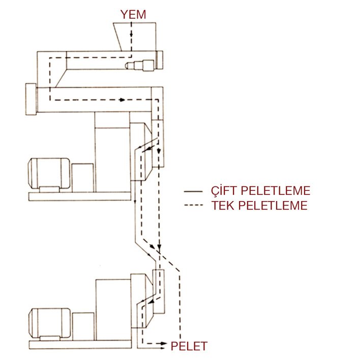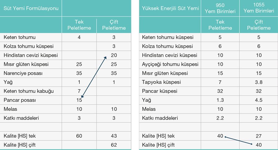Peletlemeyi tek bir büyük adımda yapmak zorsa, daha ince kalıplara, daha fazla esnekliğe, daha düşük maliyetli ham maddelere ve daha düşük üretim maliyetlerine olanak tanıyan iki küçük adıma bölmek basit bir çözümdür. Bu peletleme prensibi, tahıl ve soyanın yerini alan daha ucuz ve yüksek lifli formülasyonlarda son derece başarılıdır. Etkisi sonraki tablolarda gösterilmektedir. İlk süt yemi formülasyonunda pancar küspesi hindistan cevizi küspesi ile değiştirilmiştir. Bu daha düşük maliyetli bir formülasyondur, ancak pelet kalitesi 60’tan 43’e düşer. Çift peletleme kullanılarak, düşük maliyetli formülasyon orijinal formülasyondan biraz daha yüksek olan 62 kalite ile üretilebilir. İkinci örnek, yüksek enerjili bir formülasyonun peletleme süreci üzerindeki etkisini göstermektedir. Tapyoka küspesinin %3,2’si yağ ile değiştirildiğinde kalite 40’tan 27’ye düşmektedir. Ancak çift peletleme, yüksek enerjili formülasyonun, tek peletleme ile üretilen daha düşük enerjili formülasyonla aynı kaliteye ulaşmasını sağlamaktadır. Çift peletleme işleminin önemli bir avantajı da kapasitenin tek peletleme işlemine kıyasla çok daha istikrarlı olmasıdır. Bu, baş ağrısını azaltır ve gerekli miktarların günlük olarak üretilebilmesini sağlar.