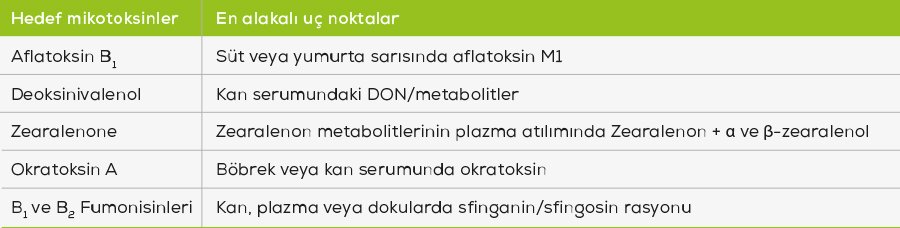 Tablo 1, etkinlikle ilgili EFSA dergi kılavuzlarında belirtildiği gibi, yemlerin mikotoksinlerle kontaminasyonunu azaltan maddeler için en uygun biyo-belirteç uç noktalarını göstermektedir.8