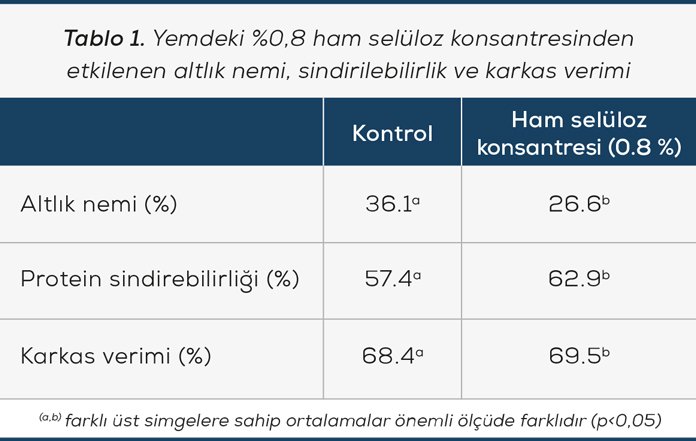Ham selüloz konsantreleri ıslak altlık sendromunu kontrol etmek için güçlü bir araçtır. Yüksek ham selüloz konsantrasyonuna sahip ham maddelerin kanatlı yemlerinde kullanımının, performansı azaltabilme riski, kesinlikle haklı bir endişe nedenidir. Ancak literatürde paylaşılan denemelere göre, ham selüloz konsantresinin %0,8 oranına kadar takviye edilmesi, kanatlı hayvanların performansı açısından risk teşkil etmez.