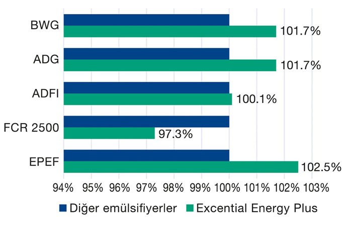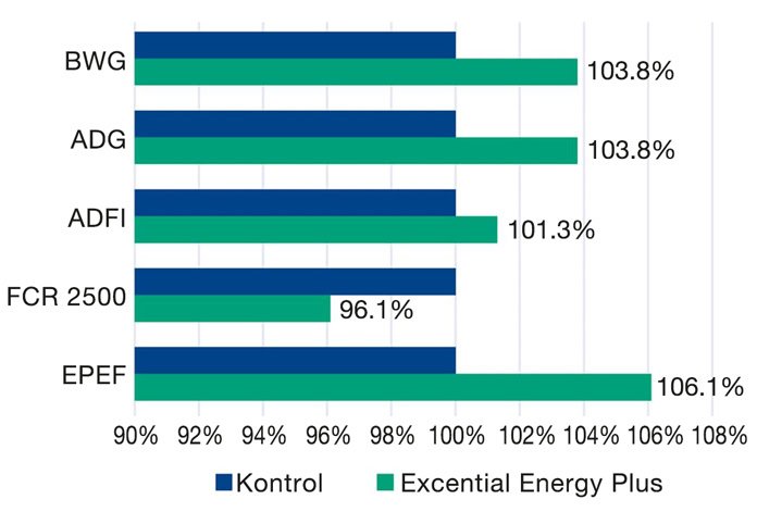 Emülsifiyer içermeyen bazal bir broyler rasyonunun üzerine 350 ppm Excential Energy Plus uygulanmasının büyüme performansını %3,8, yem verimliliğini (FCR)%3,9 ve üretim verimliliğini (EPEF)%6,1 oranında artırması beklenmektedir. Excential Energy Plus uygulandığında ve sonuçlar piyasada bulunan başka bir emülsifiyer ile karşılaştırıldığında, büyüme performansının %1,7, yem verimliliğinin (FCR) %2,8 ve üretim verimliliğinin (EPEF) %2,5 oranında artması beklenmektedir.