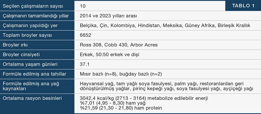 Her iki uygulama için de önceki meta-analizde olduğu gibi aynı performans parametreleri derlenmiştir. Bu sonuçlar her bir çalışma için farklı rasyon gruplarına göre derlenmiş ve istatistiksel analiz önceki meta-analize benzer şekilde gerçekleştirilmiştir.