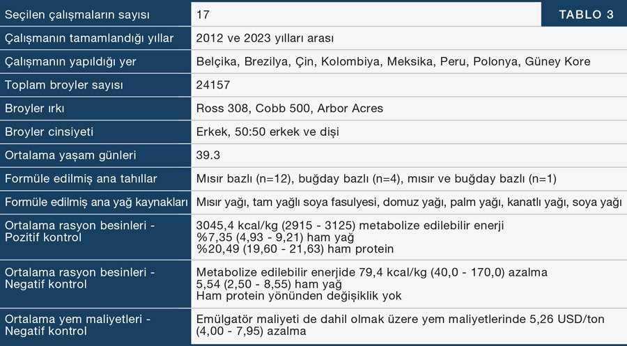 Enerji verimliliğinin iyileştirilmesi sayesinde, nutrisyonel emülsifiyerler, beslenme uzmanlarının enerji seviyeleri azaltılmış rasyonlar formüle etmelerini sağlar. Bu yem re-formülasyonu, yağ kaynakları ve toplam ham yağ (bitkisel yağlar, hayvansal yağlar ve tahıllardan elde edilen) dikkate alındığında başlangıçtaki yemle oldukça bağlantılıdır. Bu nedenle, Excential Energy Plus’ın bir enerji re-formülasyon stratejisi ile uygulandığında broyler performansı ve yem maliyetleri üzerindeki etkisini gözden geçirmek için üçüncü bir meta-analiz yapılmıştır. Bu amaçla, bilimsel ve ticari denemelerin son bir sistematik incelemesi yapılmış ve aşağıdaki kriterlere cevap veren belirli çalışmalar seçilmiştir: