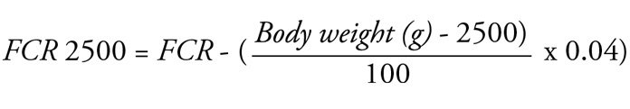 – Yem Dönüşüm Oranı (FCR), aşağıdaki formülle 2500 g vücut ağırlığına göre yeniden hesaplanmıştır: