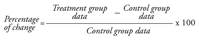 Son olarak, Excential Energy Plus grubundaki veriler kontrol grubuyla karşılaştırılırken değişim yüzdesi aşağıdaki formülle hesaplanmıştır: