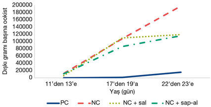 Deneme döneminde, 22 ve 24. günler arasında, negatif kontrole kıyasla salinomisin veya saponin alüminat karışımının ookist atılımını sırasıyla %39.7 ve %41.3 oranında azaltarak bu katkı maddelerinin doğrudan antikoksidiyal etkisini göstermiştir (Şekil 1).