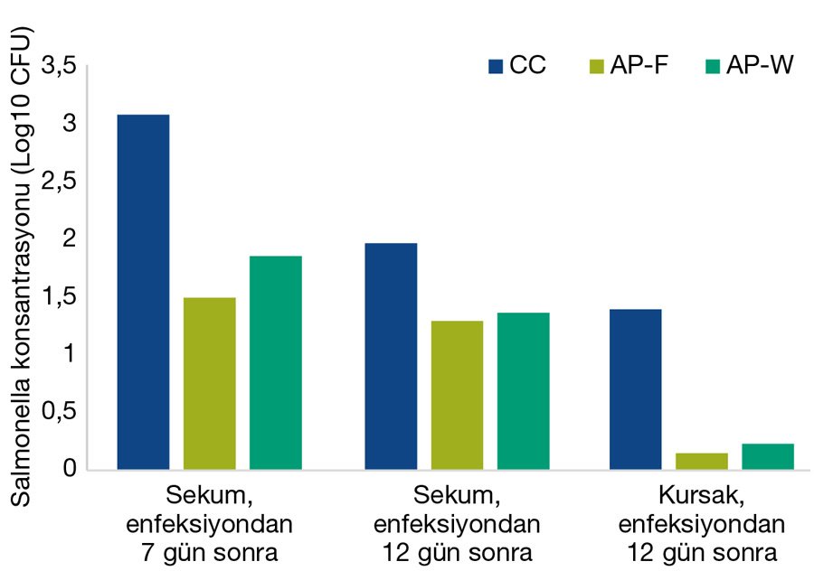Mücadeleden 7 gün sonra STM’nin çekal geri kazanımı ile ilgili olarak, AP-F (1,49) ve AP-W (1,85) uygulama grubunda, kontrol grubuna (3,07) kıyasla 1 log CFU’nun üzerinde bir azalma gözlenmiştir. Mücadeleden 12 gün sonra, sarımsak ve tarçın karışımını yem ve içme suyu yoluyla alan kanatlıların sekal numunelerinde, kontrole kıyasla STM CFU’sunda yaklaşık 0,6 log’luk bir azalma gözlenmiştir. Ayrıca kursakta, AP-W (0,23) ve AP-F (0,15) ile mücadeleden 12 gün sonra kontrole (1,39) kıyasla STM’de 1 log CFU’nun üzerinde bir azalma gözlenmiştir (Şekil 3).