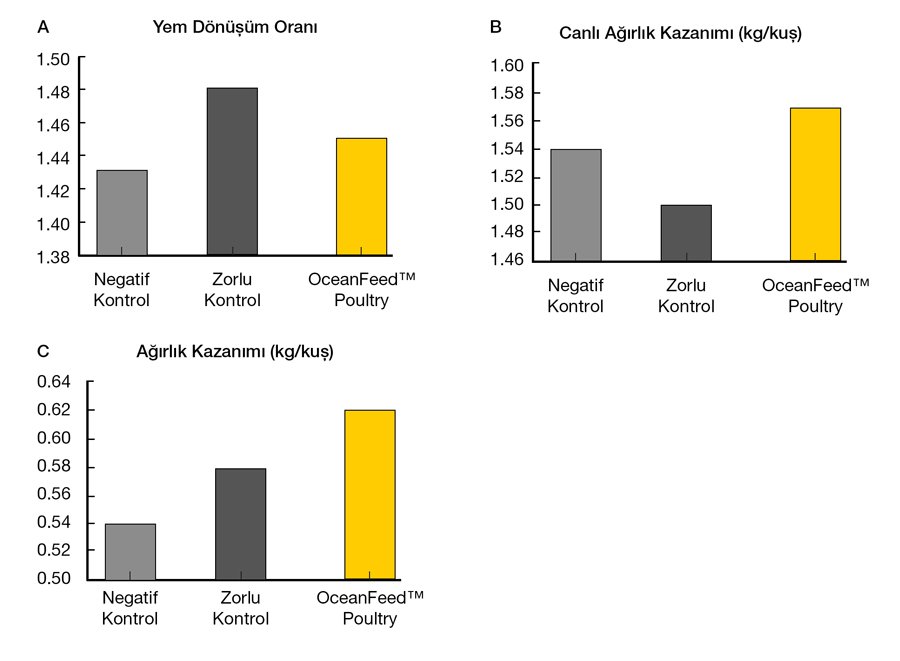 Kanatlılarda nekrotik enterit (NE), özellikle sektörün antibiyotik kullanımının azaltıldığı bir dönemde, en maliyetli bağırsak hastalıklarından biri olmaya devam etmektedir. Kontrollü bir NE denemesinde, deniz yosunu bazlı bir karışım (OceanFeed™ Poultry) verilen kanatlılar, zorlu kontrol grubuna kıyasla belirgin şekilde daha iyi sonuçlar göstermiştir. Ölüm oranları azalmış, lezyon skorları iyileşmiş, ayrıca bitirme döneminde yem tüketimi ve canlı ağırlık artışı daha yüksek olmuştur. Deneme sonrasında telafi edici büyüme gözlemlenmesi önemli bir diğer bulgudur. Bu sonuç, deniz yosunu takviyesinin yalnızca stres döneminde dayanıklılığı desteklemekle kalmadığını, aynı zamanda sonrasında da toparlanmayı güçlendirdiğini göstermektedir (Şekil 1A, 1B ve 1C).