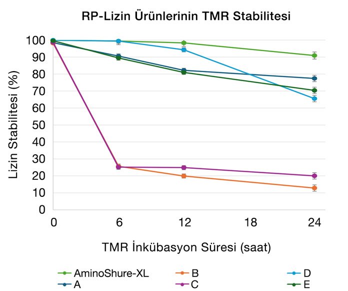 Bu sebepten dolayı, AminoShure™-L (%24,3 metabolize edilebilir lizin) veya AminoShure™-XL (%34,6 metabolize edilebilir lizin) gibi RPL olarak metabolize edilebilir lizin tedarikinin bir bölümünün dahil edilmesi önerilir. Bu, tutarlı ve güvenilir bir metabolize edilebilir lizin kaynağı sağlar.