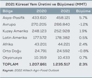 Alltech tarafından hazırlanan Agri-Food Outlook 2022 raporu ise çok daha güncel veriler sunuyor. Bu rapora göre 2020 yılında tüm dünyada gerçekleştirilen karma yem üretim miktarı 1.207,9 milyon ton olarak gerçekleşti. Bu miktar 2021 yılında %2,3’lük bir artışla 1.235,5 milyon tona ulaştı.