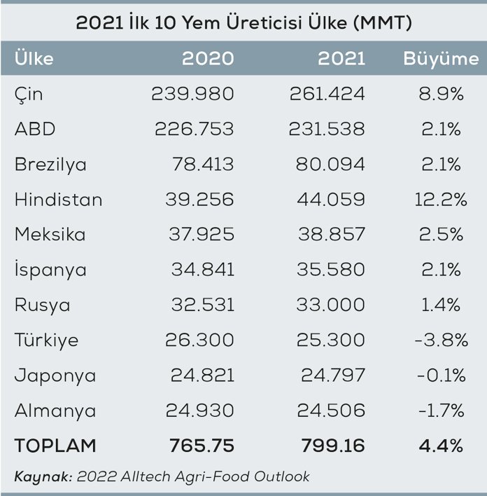 Toplam dünya yem üretiminin %65’ini temsil eden dünyanın en büyük 10 yem üreticisi ülkesi, 799,1 milyon ton yem üretti. Toplamda, bu ülkelerdeki yem üretimi %2,3’lük küresel büyümeye kıyasla %4,4 oranında arttı.