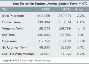 Hayvan yemi türleri arasında en büyük artış oranı %8,2 ile evcil hayvan yemlerine ait. 2020’de 31,5 milyon ton olan dünya evcil hayvan yemi üretimi, bu artışla 2021’de 34,1 milyon tona ulaştı. Avrupa, 11,5 milyon tonluk üretim miktarı ile bölgesel bazda en büyük üretici konumunda. Onu 10,6 milyon ton ile Kuzey Amerika ve 7,1 milyon ton ile Latin Amerika takip ediyor.