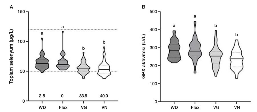 Selenyumun vejetaryenler ve veganlar için kritik bir besin maddesi olduğu, yakın zamanda insanlarda yapılan yeni bir beslenme değerlendirme çalışmasında da belirlenmiştir2. Çalışmadaki biyobelirteçler, serum selenyum ve glutatyon peroksidaz enzimatik aktivitesinin (GPX aktivitesi), diyetlerinde et olmayan katılımcılarda önemli ölçüde düşük olduğunu göstermiştir (Şekil 1). Omnivorların (%2,5) ve esnek beslenenlerin neredeyse hiçbirinde 50 µg/L sınırının altında selenyum değerleri görülmezken, vejetaryen (%33) veya vegan (%40) beslenenlerde bu durum nispeten daha sık görülmüştür. Referans aralığın altındaki selenyum konsantrasyonları, bu katılımcıların sağlık sorunları geliştirme riskinin daha yüksek olduğunu göstermektedir.