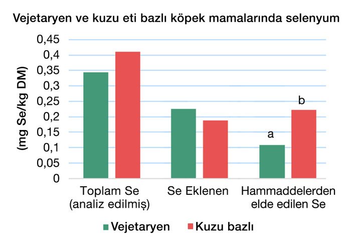 Kuzu eti bazlı mamalardaki toplam selenyum miktarı, vejetaryen mamalara kıyasla sayısal olarak daha yüksektir (Şekil 3). Tüm mamalar yetişkin köpekler için minimum (0,220 mg/kg DM) ve maksimum (0,568 mg/kg DM) selenyum seviyeleri içinde kalmıştır. Vejetaryen mamalar arasında, 6 mamanın 4’ü minimum gereksinimleri çok az aşarken, kuzu eti bazlı mamalar 0,3 mg/kg DM’nin üzerinde kalmıştır.