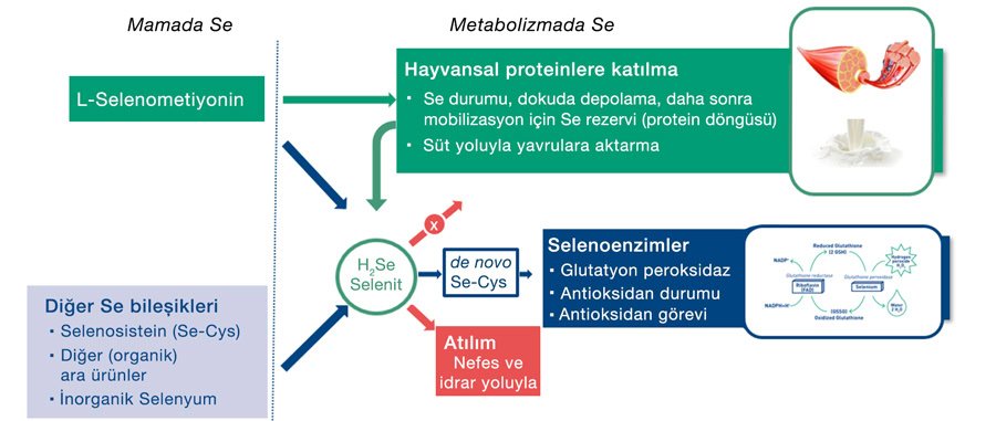 Hayvanın metabolizmasında, L-selenometiyonin ve diğer selenyum formları arasında bir fark vardır (Şekil 4). Tüm selenyum bileşikleri selenyum tedariki için kabul edilir ve hepsi selenoproteinlerin (selenoenzimler) sentezi için kullanılabilir. Bunlar antioksidan savunmada, tiroid fonksiyonunun düzenlenmesinde ve bağışıklık sistemi desteğinde hayati rol oynayan selenoenzimlerdir. Selenoenzimlere giden bu yaygın yolun yanı sıra, L-selenometiyonin vücutta bir amino asit olarak kullanılır ve metiyonin yerine vücut proteinlerine dahil edilebilir. L-selenometiyonin, bu özel yol sayesinde vücutta selenyum rezervleri oluşturabilir ve selenyumu kolostrum ve süt yoluyla yavrulara verimli bir şekilde aktarabilir.