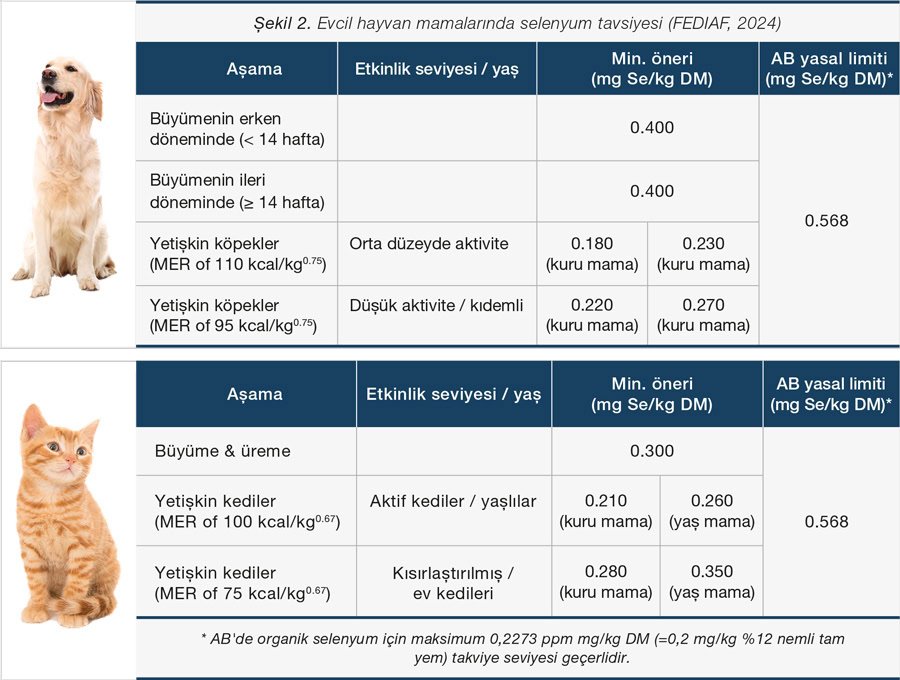 FEDIAF (2024), hem büyümekte olan hem de yetişkin köpek ve kediler için minimum selenyum seviyeleri sunmaktadır (Şekil 2). FEDIAF, yetişkinlerde, hayvanın aktivite düzeyine bağlı olarak besin seviyeleri önermektedir. Daha az aktif hayvanların bakım enerji gereksinimleri (MER) ve buna bağlı olarak günlük mama alımları daha düşüktür. Dolayısıyla daha az aktif hayvanların günlük gereksinimlerini karşılamak için mamalardaki selenyum içeriği daha yüksek olmalıdır. Her ne kadar FEDIAF aşırı kilolu hayvanlar için özel olarak gereksinimleri belirtmese de MER’in aşırı kilolu köpekler ve kediler için sırasıyla 95 kcal/kg0.75 ve 75 kcal/kg0.67’nin bile altında olduğu görülebilir. Kilo verme diyetleri genellikle daha düşük enerji yoğunluğuna sahip olsa da, bu hayvanlara sağlanan günlük yiyecek miktarı normal büyüklükteki evcil hayvanlara kıyasla hala daha azdır. Minimum günlük tavsiyeye ulaşmak için, aşırı kilolu evcil hayvanlar için uygulanan diyetteki selenyum seviyesi, kg kuru madde (DM) başına 0,568 mg selenyum olan Avrupa yasal sınırına çok yakın olacaktır.