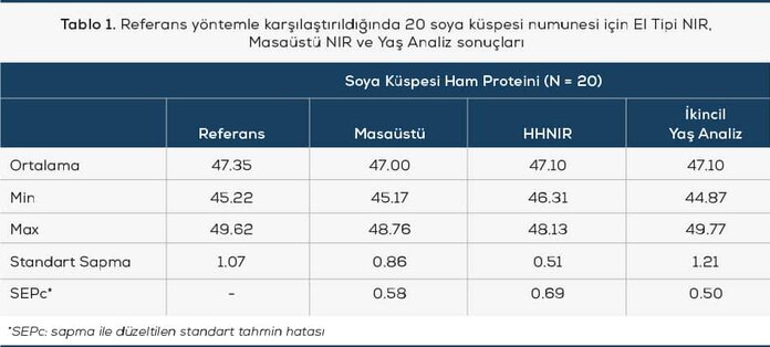 Elde taşınır cihazlar, bir masaüstü cihazınkine benzer bir kalibrasyon doğruluğuna ve de referans yönteminin beklenen belirsizliği dahilinde (soya fasulyesi küspesi ham proteini için ± %1-1.5, Dumas/Kjeldahl) bir dalga boyu kapsamına ve çözünürlüğüne sahiptir (Tablo 1).