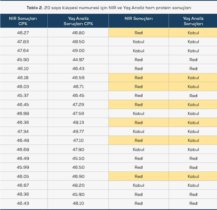 Bu değerlendirme, NIR’ın, bileşenlerin kalitesini karakterize ederek anında karar vermeye, bir tedarikçiden gelen yükü kabul veya reddetmeye ya da farklı silolara yükler atamaya olanak tanıyan bir araç olarak kullanılabileceğini göstermektedir (Tablo 2).