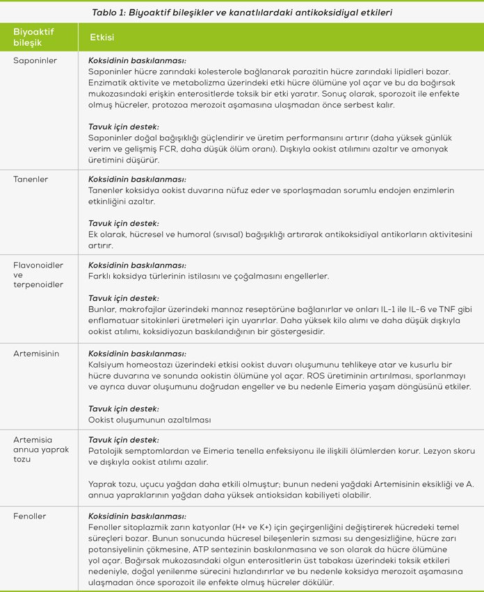 Yakın tarihli bir derleme makalesinde (El-Shall ve ark., 2022), doğal bitkisel ürünler ve bunların özütlerinin, tavuk bağırsak dokularında Eimeria türlerinin istilasını, çoğalmasını ve gelişimini engelleyerek ookist oluşumunu etkili bir şekilde azalttığı tanımlanmıştır. Bitkisel ekstraktlardaki fenolik bileşikler, koksidya hücre ölümüne neden olur ve ookist sayısını düşürür. Ayrıca, bitkisel katkı maddeleri bağırsak lipid peroksidasyonunu azaltma, epitel onarımını kolaylaştırma ve Eimeria kaynaklı bağırsak geçirgenliğini azaltma gibi faydalar sunar.