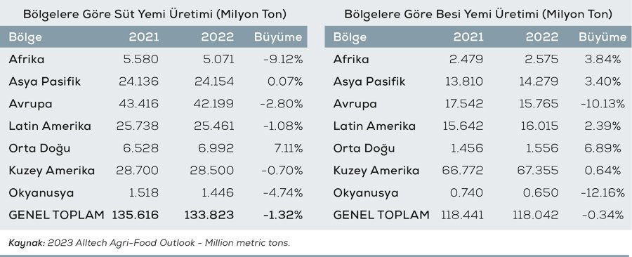2022’de 1,5 milyon ton süt yemi üreten Okyanusya’da ise bir önceki yıla göre yaklaşık %5’lik bir düşüş söz konusu. Alltech Agri-Food Outlook 2023 raporuna göre, Yeni Zelanda’nın süt yemi tonajında %23,7’lik (0,028 MMT) bir artış oldu. Yüksek süt fiyatları çiftçileri daha fazla yem vermeye teşvik etti ancak bu durum yüksek yem fiyatlarıyla dengelendi. Avustralya’nın süt yemi üretimi %7’nin üzerinde düştü ve bu da genel bölgesel düşüşün %5 civarında olmasına yol açtı.
