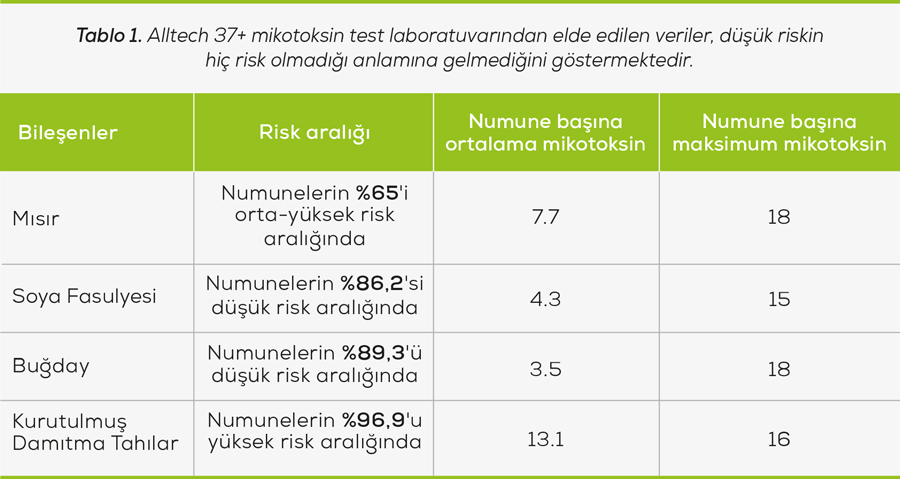 Mısır, darı, buğday, sorgum, soya fasulyesi, yer fıstığı ve kontamine olmuş ana bileşenlerden elde edilen yan ürünler, mikotoksinlere karşı en hassas ürünlerdir. Kanatlı rasyonlarında, en fazla risk taşıyan ürünler mısır ve yan ürünleri olurken, küçük taneler daha düşük riskli bileşenler olma eğilimindedir. Ancak, 700 kanatlı numunesindeki bileşenlere tek tek baktığımızda, düşük riskin hiç risk olmadığı anlamına gelmediğini görebiliriz. Ortalama olarak buğday ve soya fasulyesinde numune başına düşük sayıda mikotoksin bulunurken, bireysel numunelerde 15 (soya fasulyesi) ve 18 (buğday) gibi farklı türde mikotoksin tespit edilmiştir.