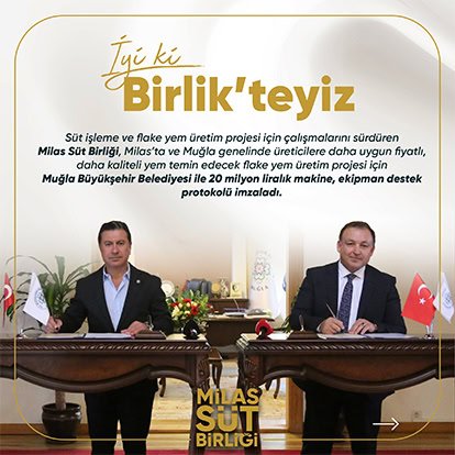 Milas Organize Sanayi Bölgesi’nde yapımı devam eden süt işleme ve flake yem üretim projesi için çalışmalarını sürdüren Milas Süt Birliği, Milas’ta ve Muğla genelinde üreticilere daha uygun fiyatlı ve daha kaliteli yem temin edecek flake tesisi için Muğla Büyükşehir Belediyesi ile 20 milyon liralık makine ve ekipman desteği protokolüne imza attı.