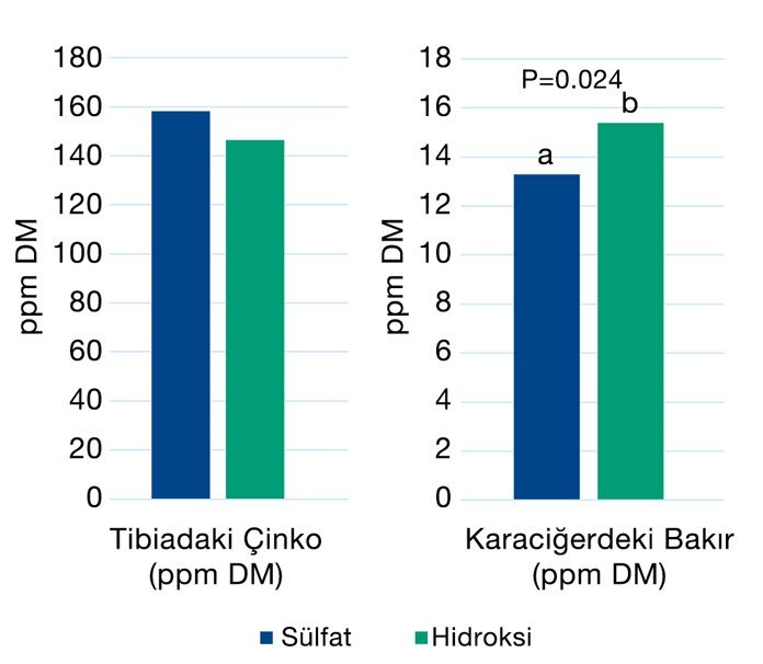 Daha önce de belirtildiği gibi, yem sürdürülebilirliğini optimize etmek söz konusu olduğunda biyoyararlanımı yüksek mineral kaynakları önemlidir. Birinci nesil eser mineralleri ikame ederken biyoyararlanım iyileştirilebilir. Bu sayede, benzer (veya daha iyi) sonuçlar alınmakla birlikte ürünün dozajı azaltılabilir. Broylerlerde, 870 adet Ross-308 günlük civciv üzerinde yürütülen bir çalışmada, çinko ve bakır sülfatın biyoyararlanımı, daha düşük dozda takviye edilen hidroksi formlarıyla (Excential SMART Z + C, Orffa Additives BV) karşılaştırılmıştır. Hayvanlar iki gruba ayrılmıştır: 1. Kontrol rasyonu + 120 ppm çinko (çinko sülfat) + 15 ppm bakır (bakır sülfat) ve 2. Kontrol rasyonu + 80 ppm çinko (hidroksi çinko) + 10 ppm bakır (hidroksi bakır). 42 günlük besleme denemesinden sonra, tibiadaki çinko içeriği ve karaciğerdeki bakır miktarı analiz edilmiştir (Şekil 3). Sonuçlar, tibiadaki çinko birikiminde önemli bir fark olmadığını göstermektedir. Hidroksi çinko daha düşük bir dozda (10 ppm) eklenmiş olmasına rağmen, birikim üzerindeki etkileri daha yüksek dozdaki (15 ppm) çinko sülfatın sonuçlarıyla karşılaştırılabilir düzeydedir. Karaciğerdeki bakır birikimi için, daha düşük dozdaki (80 ppm) hidroksi bakırın, daha düşük dozdaki (120 ppm) bakır sülfata kıyasla daha yüksek bakır seviyelerine yol açtığı görülmüştür. Bu denemenin sonuçları, hidroksi çinko ve bakırın, çinko ve bakır sülfata kıyasla biyoyararlanımının daha yüksek olduğunu göstermektedir. Bu sayede, yemdeki çinko ve bakır seviyelerinin azaltılmasına olanak tanınırken, hedef hayvanda benzer, hatta daha iyi çinko ve bakır seviyeleri elde edilmektedir. Biyoyararlanım konusunda benzer sonuçlar diğer türler (ör. ruminantlar) için de bulunabilir.