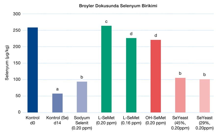 İki haftalık besleme sonunda selenyum birikimini analiz etmek için her tekrar grubundan üç kanatlıdan göğüs kası örnekleri alınmıştır. Karşılaştırma amacıyla, 0. günde kontrol grubunda da aynı örnekleme ve analizler yapılmıştır. Sonuçlar (Şekil 1), 0. günde (d0) kanatlıların kaslarında iyi bir selenyum birikimi olduğunu, ancak yaşamlarının ilk iki haftasında (kontrol grubu) selenyum takviyesi yapılmadığında bu deponun tükendiğini göstermektedir. Düşük L-SeMet seviyelerine (sırasıyla %45 ve %29) sahip sodyum selenit veya selenize maya takviyesi, kaslarda depolanan selenyumun hafifçe telafi edilebilmesini sağlamıştır. L-SeMet ve OH-SeMet karşılaştırıldığında, sonuçlar düşük dozajlı L-SeMet (0,16 ppm) ve OH-SeMet (0,20 ppm) arasında kas dokusunda benzer selenyum birikimi olduğunu ortaya koymuştur. Ancak, daha yüksek dozda L-SeMet (0,20 ppm) kullanıldığında, broyler kas dokusunda selenyum birikimi önemli ölçüde daha yüksek (P<0,05) olmuştur ve OH-SeMet (0,20 ppm) ile karşılaştırıldığında %17 artış göstermiştir.
