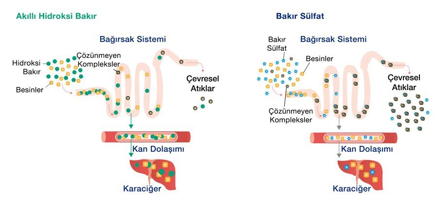 Şekil 2. Gastrointestinal sistemdeki hidroksi bakır (Excential SMART, Orffa Additives BV) ile bakır sülfatın karşılaştırması