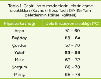 Kullanılan tahıl tanesi (mısır ve buğday) ve yem içeriğindeki yüzdesi, kaliteyi etkileyecektir çünkü nişastanın kaynağına bağlı olarak jelatinleşmeyi sağlamak için gereken hedef sıcaklıklar farklı olacaktır (bkz. Tablo 1).