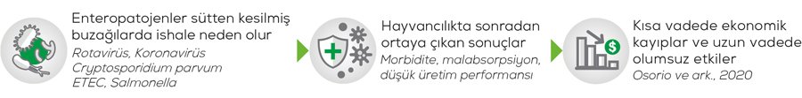 Buzağı sağlığı yönetimi çok önemlidir ve yetişkin ineğin performansını etkileyecektir (Şekil 1). Araştırmalar (Abuelo ve ark., 2021), 305 günlük yetişkin eşdeğeri (ME) süt üretimi standart değerine bakıldığında, buzağıyken ishalden etkilenen düvelerin sütten kesimde daha düşük ortalama günlük kazanç ve -325 kg süt ile daha düşük bir ilk laktasyon performansı gösterdiğini ortaya koymaktadır. Buna ek olarak, ishal ve sığır solunum hastalığı (BRD) teşhisi konulan düveler, tohumlama ve buzağılama sırasında daha fazla zorluk yaşama eğilimindedir.
