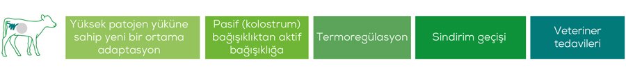 Yaşamın erken dönemlerinde, bağışıklık henüz zayıfken (Şekil 3), buzağılar çok sayıda dış stres faktörüyle (Şekil 2) karşılaşır (taşıma, sıvı yemden katı yeme geçiş, boynuzsuzlaştırma, vb.). Tüm bu stres faktörleri, bağışıklık sistemini daha savunmasız hale getirerek hastalık ve ölüm riskini artırır. Bu durum sindirim ve solunum yolu hastalıklarına yol açabilir. Mortalite ve morbiditenin başlıca nedenleri sindirim zorluklarıdır (sırasıyla %32 ve %51) (Urie ve ark., 2018).