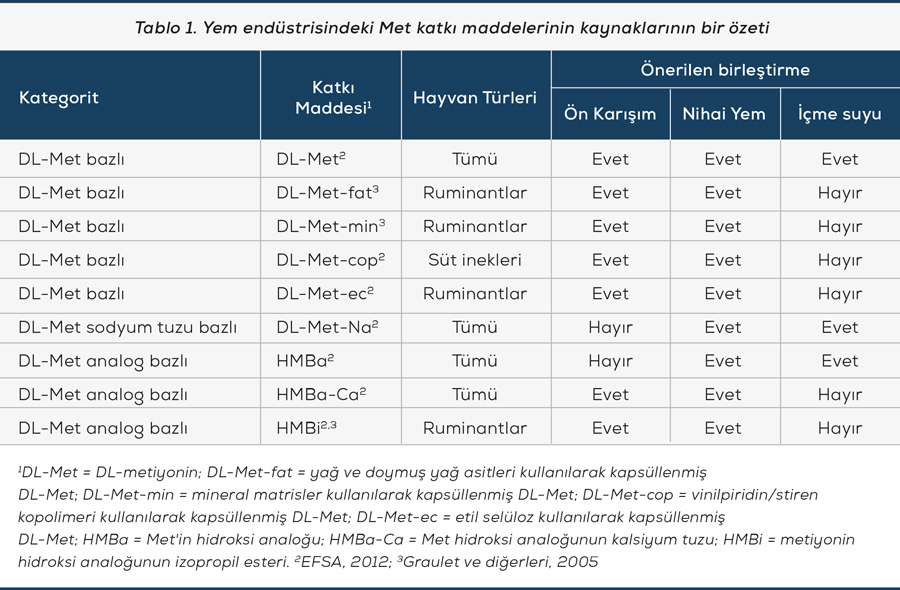 Hayvansal gıda üretim endüstrisinde kullanılan metiyonin katkısı (Tablo 1), DL-Met, DL-Met sodyum tuzu ve Met analog bazlı olmak üzere üç farklı kaynakta kategorize edilebilir. Şu anda piyasada 5 ana DL-Met bazlı ürün, bir DL-Met sodyum tuzu bazlı ve üç Met analog bazlı kategori bulunuyor. Met analog bazlı katkı maddeleri Met’in hidroksi analoğu (HMBA), Met hidroksi analoğunun kalsiyum tuzu (HMBA-Ca) ve HMBi’dir.