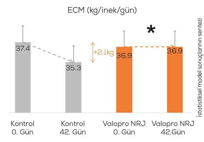 Sonuçlar, 30 g/inek/gün Valopro NRJ’nin süt verimini ve ECM’yi önemli ölçüde artırabileceğini ve süt inekçiliği sisteminde karlılığı artırmak için uygun bir çözüm olduğunu göstermektedir.
