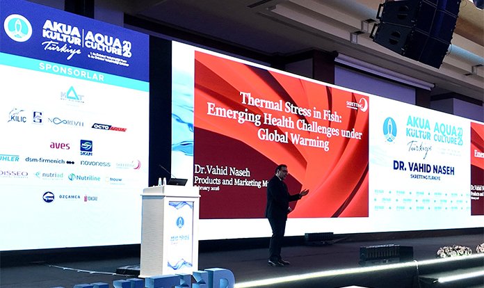 Skretting Ürün ve Pazarlama Müdürü Dr. Vahid Naseh, 11. Su Ürünleri Yetiştiriciliği Çalıştayı kapsamında “Thermal Stress in Fish: Emerging Health Challenges under Global Warming” başlıklı bir sunum gerçekleştirdi. Sunumunda küresel ısınmanın balık sağlığı üzerindeki etkilerine ve genel olarak iklim değişikliğinin su ürünleri yetiştiriciliği üzerindeki artan baskısına dikkat çeken Dr. Naseh, konuyla ilgili güncel bilimsel verileri paylaştı ve bu zorlukla başa çıkma noktasında Skretting’in sunduğu yenilikçi besleme yaklaşımlarını ve çözümlerini anlattı.