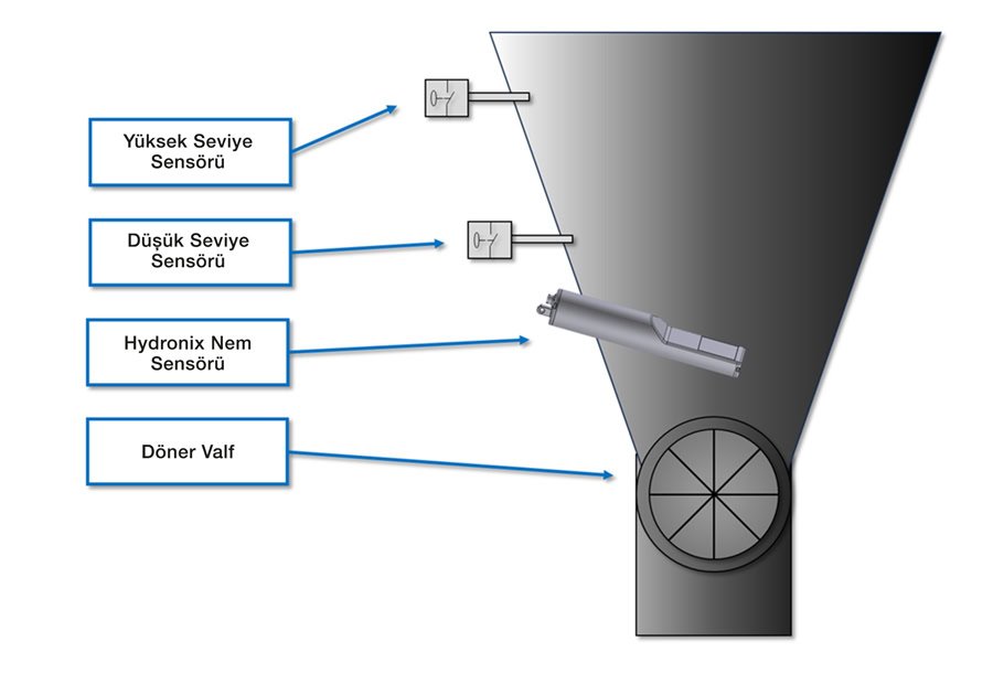 Şekil 2’de, bir yağ kaplayıcıdan önce tutma hunisi üzerindeki nem kontrolü kurulumunun bir örneği gösterilmektedir. Bu, malzemeyi yaklaşık 60°C’de tutar ve kurutucudan beslenir. Böylece, kaplayıcının çalışırken sabit bir malzeme beslemesine sahip olmasını sağlayarak şekilde bir malzeme tamponu oluşturulur. Bu kurulumda, dozajlanan malzemenin nemini ölçmek için bir Hydronix sensörü kullanılır. Sensörün entegre ortalama alma (ve filtreleme) işlevleri sayesinde, kontrol sisteminde karmaşık değişiklikler yapılmasına gerek kalmadan, bu işlem kolayca gerçekleştirilebilmektedir.