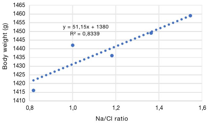 Ekonomik ve çevresel soruların ötesinde, hayvan fizyolojisi ve kan pH düzenlemesi aynı kuralları takip etmeye devam etmektedir ve uygun homeostazın sağlanması için elektrolit dengesinin korunması gerekmektedir. Scottish Agricultural College’da yapılan yeni bir çalışma, rasyondaki minimum potasyum seviyesini belirleme sorusunu ele almayı ve düşük ham proteinli rasyon (%17,5) bağlamında broylerler için optimum DEB değerini yeniden ele almayı önermektedir. İlk sonuçlar, minimum potasyum seviyesinin %0,63 – 0,7 arasında olduğu ve potasyum seviyesinin bu değerin üzerine çıkarılmasının performans üzerinde bir etkisi olmadığıdır. İkinci sonuç ise, potasyum düşük olduğunda FCR’yi optimize etmek için minimum Na/Cl oranını 1,00’de tutmanın geçerliliğini yeniden teyit etmektir (Şekil 1). Ancak, bu oranın 1’in üzerine çıkarılması, Vücut Ağırlığı Kazanımını iyileştirmeye devam etmektedir (Şekil 2). DEB değerinin, bu yeni formülasyon bağlamında daha önce belirlenenden daha düşük olabileceği de gözlemlenmiştir.