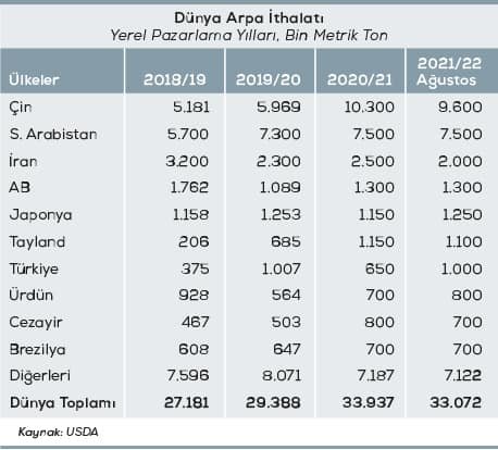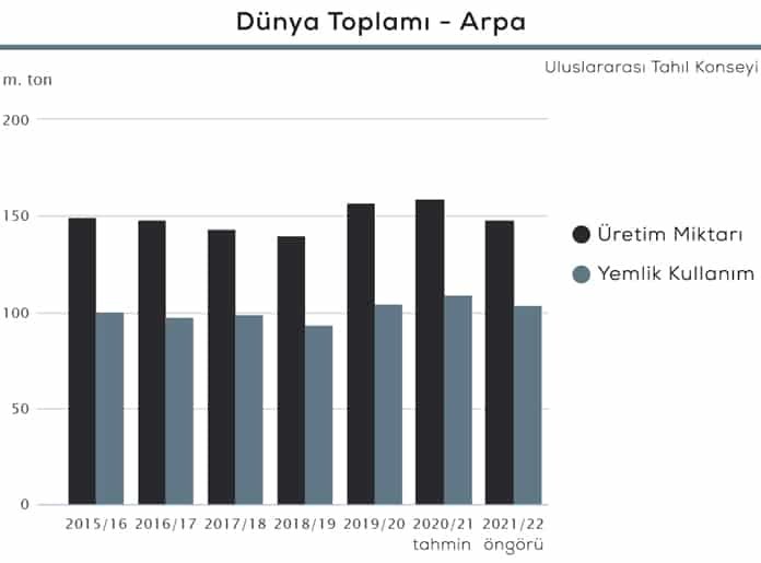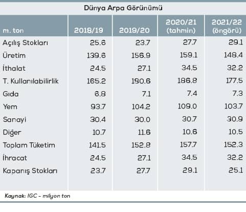 IGC verilerine göre; 2018/19 sezonunda 24,5 milyon ton olan dünya arpa ticareti, 2019/20 sezonunda 27,1 milyon tona ulaştı. IGC, ticaretin 2020/21 sezonunda 34,5 milyon tona ulaştığını tahmin ediyor. 2021/22 öngörüsünde ise dünya ticaretine konu olan arpa miktarının, 2,3 milyon tonluk gerileme ile 32,2 milyon tona düşeceği öngörülüyor.