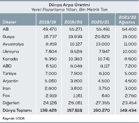 Uluslararası kuruluşlar tarafından dünyadaki tahıl durumuna ilişkin bilgi veren raporlar, içinde bulunduğumuz sezonda arpa üretimde önemli bir düşüş yaşanacağına işaret ediyor. Örneğin; Uluslararası Tahıl Konseyi (IGC)’nin 2021 Ağustos ayı verilerine göre 2018/19 sezonunda 139,6 milyon ton olan dünya arpa üretimi, 2019/20 sezonunda 156,9 milyon tona; 2020/21 sezonunda da 159,1 milyon tona ulaştı. Ancak içinde bulunduğumuz 2021/22 sezonunda arpa üretiminde önemli bir düşüş yaşandığı dikkat çekiyor. IGC’nin verileri, küresel arpa üretiminin yaklaşık 10 milyon ton gerileme göstererek 148 milyon ton seviyelerinde gerçekleşeceğine işaret ediyor. Dünya genelinde birçok bölgede yaşanan kuraklığın, bu düşüşte önemli bir payı olduğu düşünülüyor.