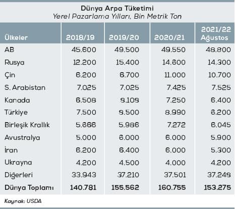 USDA tahminlerine göre; 2020/21 sezonunda AB 49,5 milyon ton, Rusya 14,6 milyon ton, Çin 11 milyon ton, Suudi Arabistan 7,4 milyon ton, Kanada 7,2 milyon ton, Türkiye ise 8,9 milyon ton civarlarında arpa tüketimi gerçekleştirdi. Söz konusu ülkelerin hemen hemen hepsinin 2021/22 sezonunda da (bir miktar gerilemeyle birlikte) benzer oranlarda tüketim gerçekleştireceği tahmin ediliyor.