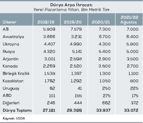 Uluslararası arpa ticaretinde öne çıkan ülkeler sıralaması da son birkaç sezondur çok değişmedi. İhracatta AB, Avustralya, Ukrayna, Rusya, Arjantin ve Kanada başı çekiyor. 2020/21 sezonunda 7 milyon ton ihracat gerçekleştirdiği tahmin edilen AB’nin, içinde bulunduğumuz sezonda da yine 7 milyon ton civarında ihracat gerçekleştirmesi bekleniyor. Aynı dönemde Avustralya’nın 6,4 milyon ton, Ukrayna’nın 5,8 milyon ton, Rusya’nın 5 milyon ton, Arjantin’in 3,5 milyon ton, Kanada’nın ise 2,7 milyon ton arpa ihracatı gerçekleştireceği öngörülüyor.