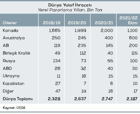 USDA verilerine göre; 2018/19 sezonunda 2,3 milyon ton olan dünya yulaf ticareti, 2019/20 sezonunda 2,6 milyon tona ulaştı. USDA, ticaretin 2020/21 sezonunda 2,7 milyon tona ulaştığını tahmin ediyor. 2021/22 öngörüsünde ise dünya ticaretine konu olan yulaf miktarının, 560 bin tonluk gerileme ile 2,1 milyon tona düşeceği öngörülüyor.