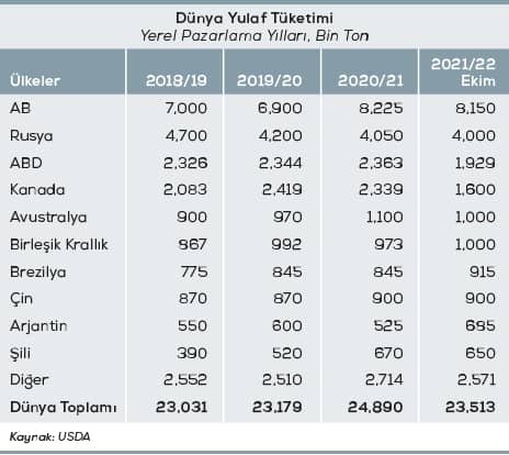 USDA verilerine göre; 2020/21 sezonunda AB 8,2 milyon ton, Rusya 4 milyon ton, ABD 2,3 milyon ton, Kanada 2,3 milyon ton, Avustralya 1,1 milyon ton, Birleşik Krallık ise yaklaşık 1 milyon ton civarlarında yulaf tüketimi gerçekleştirdi. Söz konusu ülkelerin hemen hemen hepsinin 2021/22 sezonunda da (bir miktar gerilemeyle birlikte) benzer oranlarda tüketim gerçekleştireceği tahmin ediliyor.