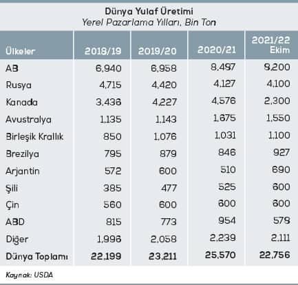 Dünya yulaf üretiminde ülkelerin paylarına bakıldığında Avrupa Birliği’nin ilk sırada yer aldığı görülüyor. USDA’nın 2020/21 verilerine göre; 8,4 milyon tonla dünya yulaf üretiminde ilk sırada yer alan AB’yi 4,5 milyon tonla Kanada, 4,1 milyon tonla Rusya, 1,6 milyon tonla Avustralya, 1 milyon tonla Birleşik Krallık takip ediyor. 2021/22 sezonuna yönelik tahminler ise AB’de üretimin 8,2 milyon tona gerileyeceğine işaret ediyor. Rusya’da üretimin hemen hemen aynı seviyelerde kalacağı görünürken, üretimdeki en büyük gerilemenin yaklaşık 2,2 milyon tonla (2,3 milyon ton) Kanada’da yaşanacağı görülüyor.