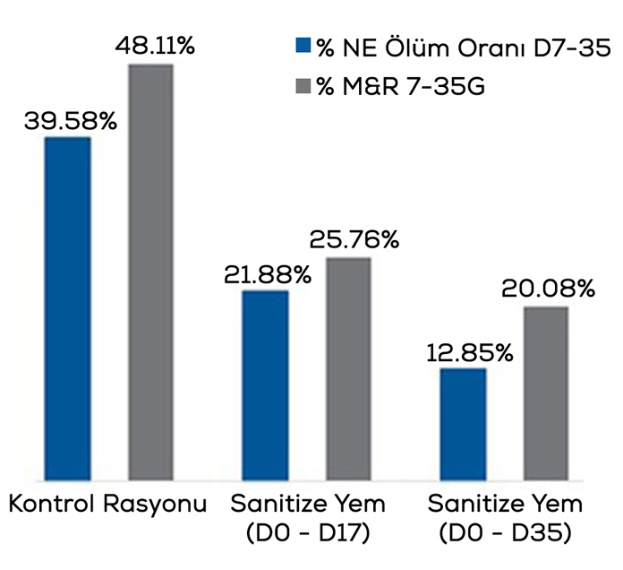 Yemdeki mikrobiyal yükleri kontrol etmek, performansı artırmaya yardımcı olabilir. Örneğin, Clostridium perfringens, mikrobiyom dengesizliği sırasında anormal şekilde çoğaldığında ciddi sağlık sorunlarına neden olabilen bir mikroorganizmadır. Halen devam etmekte olan araştırmanın ön sonuçları, yemdeki mikrobiyal yüklerin azaltılmasının sağlıklı bir mikrofloranın gelişimini destekleyebileceğini, lezyonların ve ölümlerin şiddetini azaltabileceğini ve etlik piliçlerde bir Nekrotik Enterit mücadelesi sırasında kilo alımını ve yem dönüşümünü iyileştirebileceğini göstermektedir.