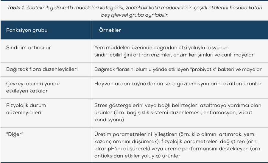 Avrupa Gıda Güvenliği Otoritesi (EFSA) zooteknik yem katkı maddelerini, hayvan performansını veya çevreyi olumlu yönde etkileyen katkı maddeleri kategorisi olarak tanımlamaktadır. İşlevleri, hayvan yeminin sindirilebilirliğini artırmaktan hayvanların strese karşı direncini yükseltmeye kadar çok çeşitlidir (Tablo 1).